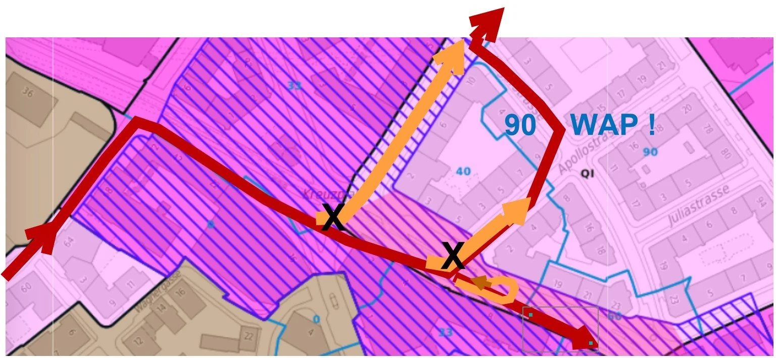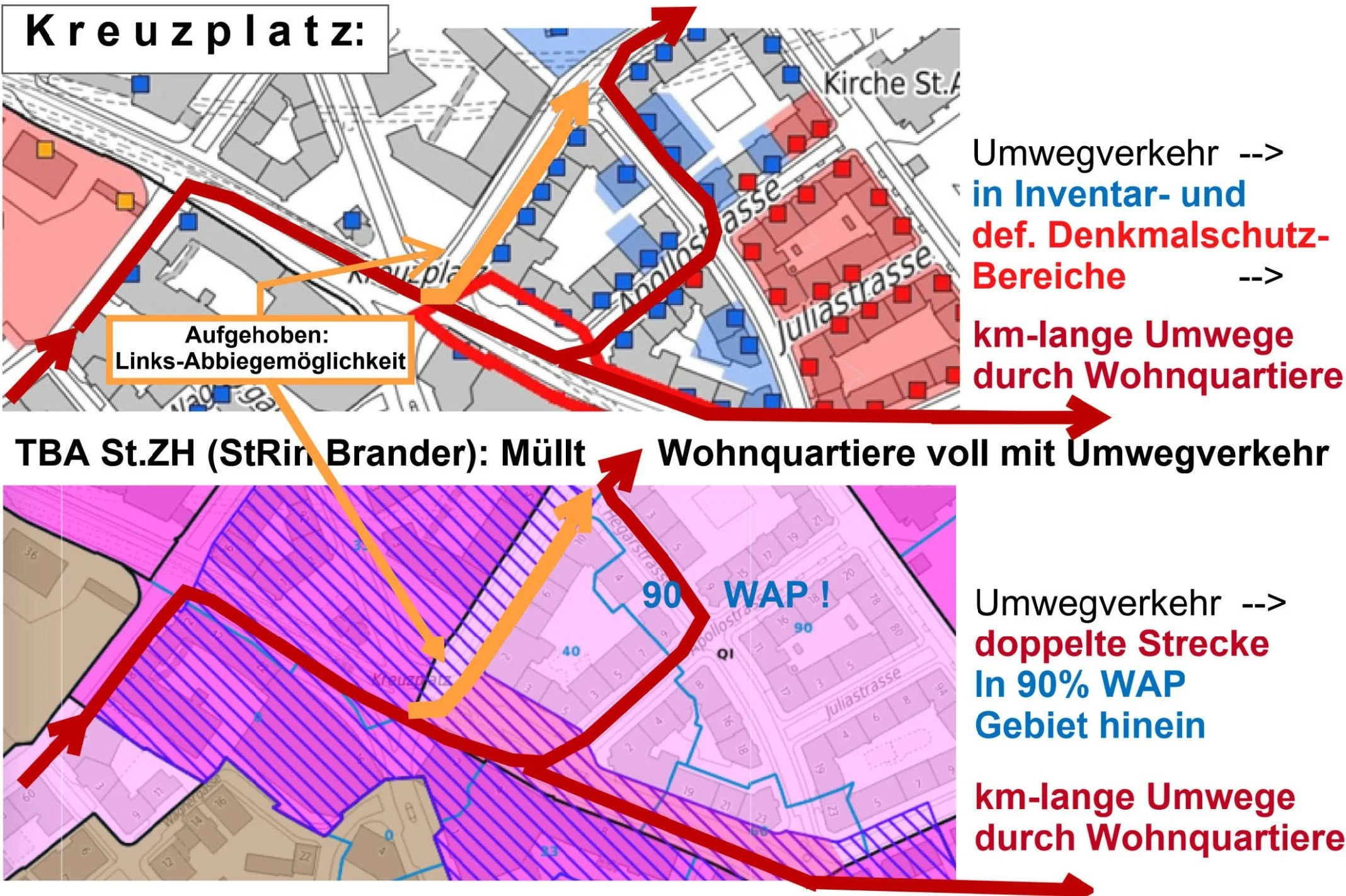 Das neue Linksabbiege-Verbot in die Klosbachstrasse lenkte diesen Verkehr hinter dem Kreuzplatz - natürlich voraussehbar, aber ignoriert - ins WAP-90%-geschützte und tlw. inventarisierte Wohnquartier…: eine Folge des Verzichts der TBA-”Velo-Planer”, sich für den heute überdimensionierten Velostreifen auch Land vor der Migros zu enteignen). Der Linksabbiegeverkehr wurde nun hinter den Kreuzplatz links in die Apollostrasse hinein verwiesen…